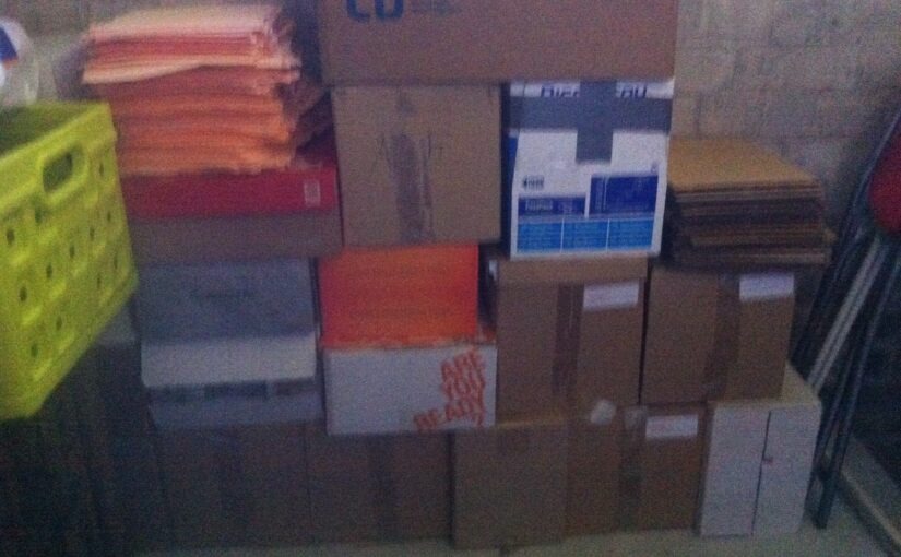 We hebben een kleine schuur met daarin een halve muur speciaal bestemd voor scheurpapier. Het staat op een speciaal getimmerde verhoging zodat het schoon en droog blijft. Er staan enorme stapels, dozen, bakjes. Alles is gesorteerd (alle lege kanten naar boven óf allemaal naar beneden) en ontniet.
